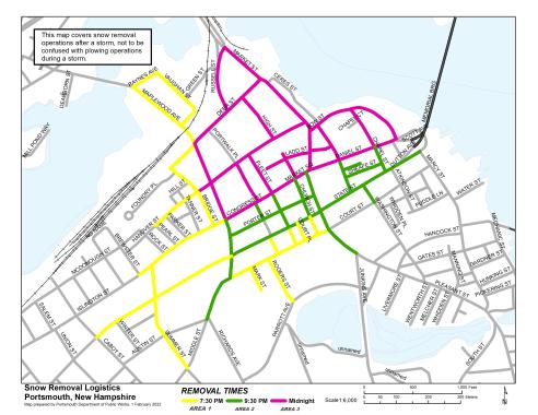 City of Portsmouth Department of Public Works crews will conduct snow load out operations to clear street and improve safety following the weekend blizzard. The load-out operations start Tuesday, February 1 at 7:30 pm in Area 1, 9:30 pm in Area 2 and 12:30 am in Area 3. The work is expected to be completed by 8 am on Tuesday, February 2.