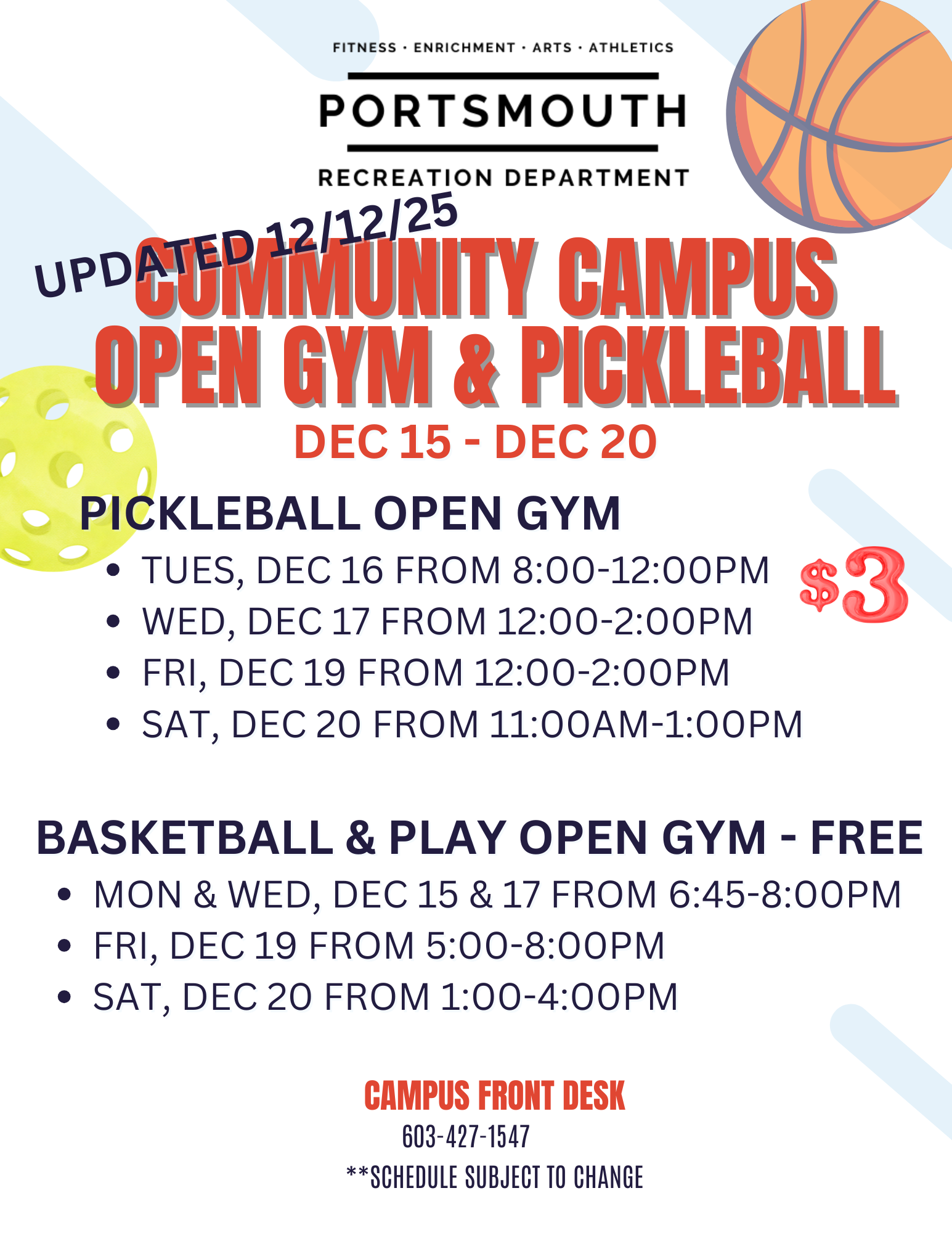 - Open Gym/Pickleball Schedule for Dec 22-Jan 3 will be posted as of Fri, Dec 19.