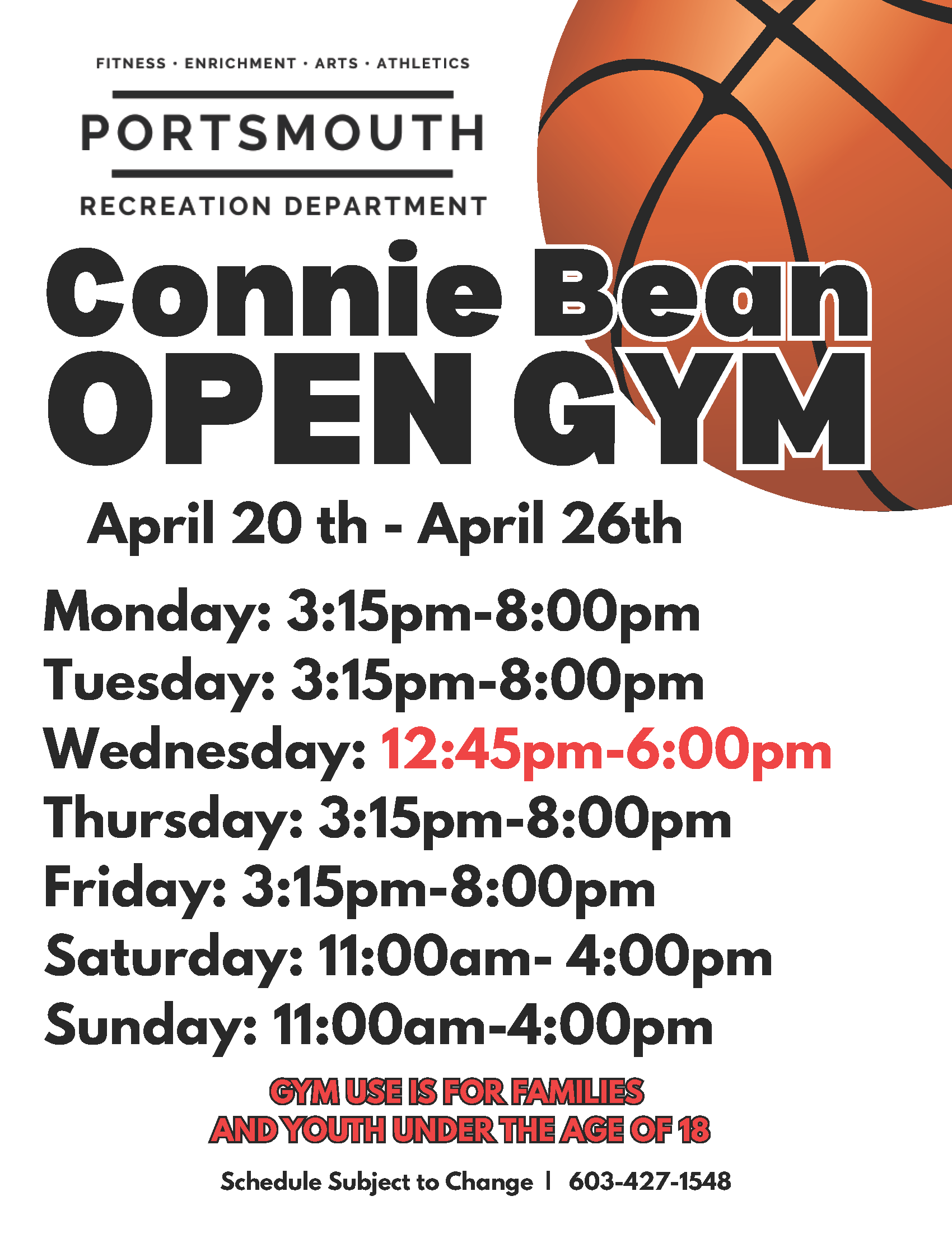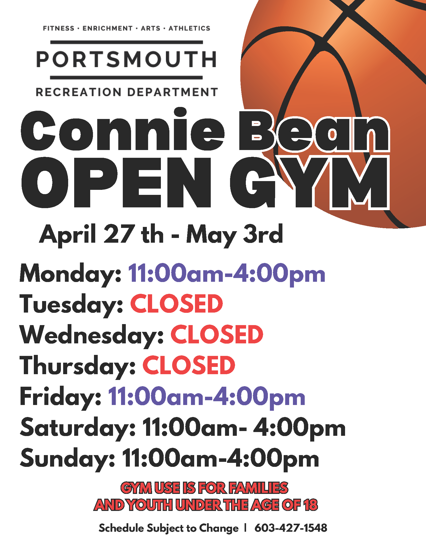 Connie Bean Center Connie Bean CenterA youth center for ages 18 and under.Open Gym hours are listed below. For information about Connie Bean Center programming (basketball, soccer, summer camps), please visit Portsmouth Recreation's program pages:Youth ProgramsSummer Programs Connie Bean Open Gym Hours Content Staff Contact Jamie Schaaf Recreation Supervisor (603) 427-1548 More Info