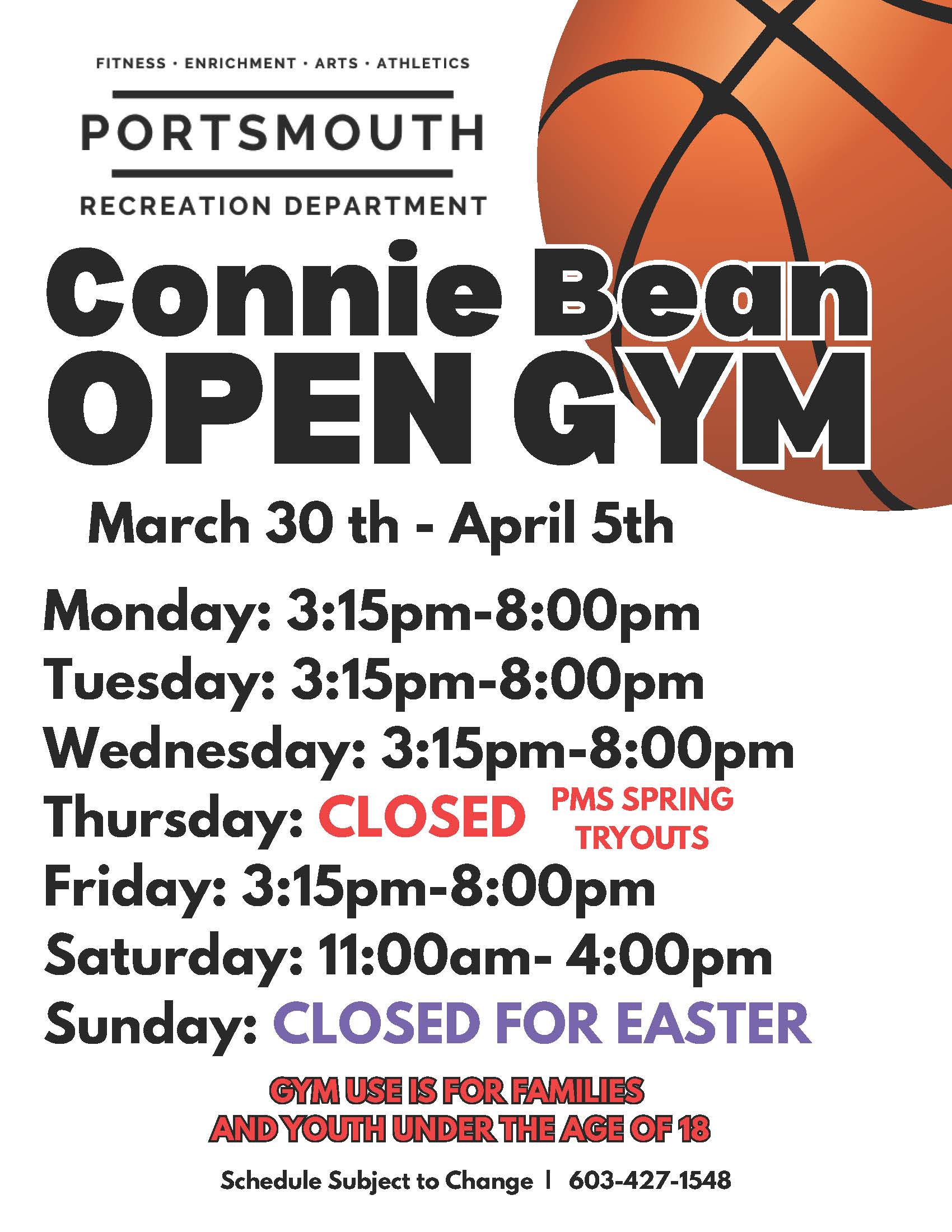 Connie Bean Center Connie Bean CenterA youth center for 18 and under.Open Gym hours are listed below. For information about Connie Bean Center programming (basketball, soccer, summer camps), please visit our Program Pages:Youth ProgramsSummer Programs Connie Bean Open Gym Hours Content Updated 3/30/26 Staff Contact Jamie Schaaf Recreation Supervisor (603) 427-1548 More Info
