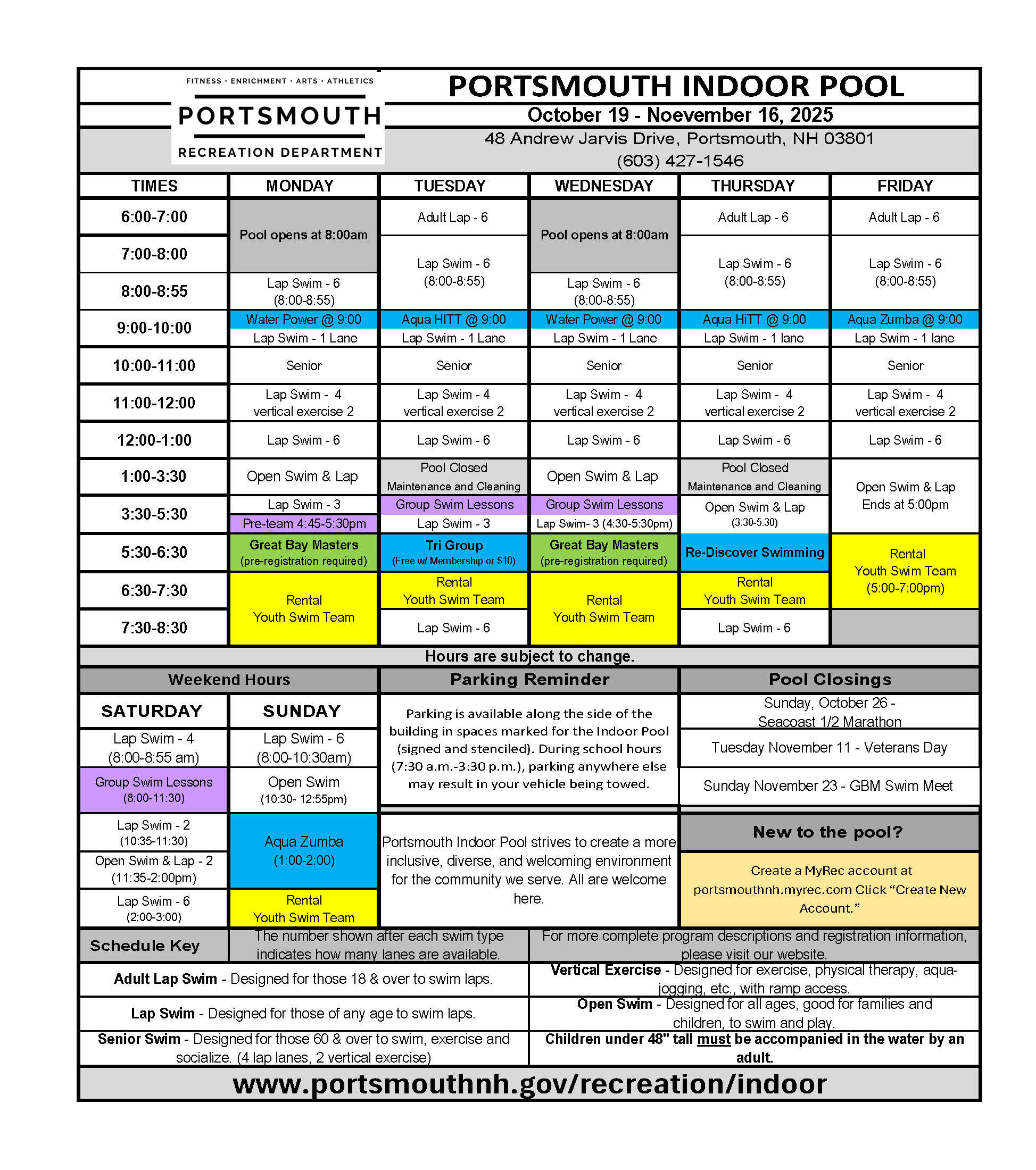 Open Swim - Designed for all ages, good for families and children, to swim and play. (Children under 48" tall must be accompanied in the water by an adult.)