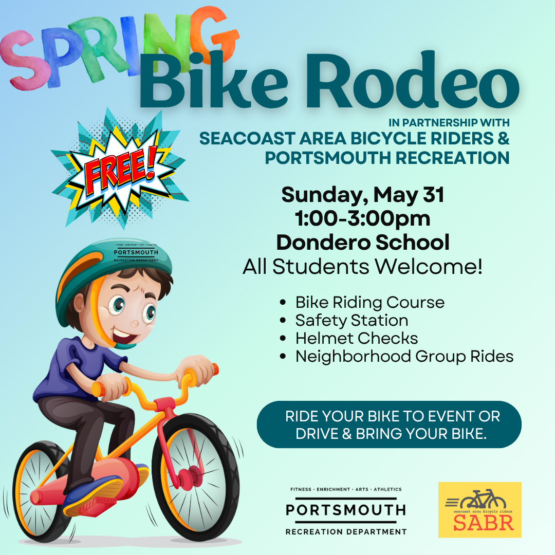 Bring your bikes to ride the obstacle course, take a group ride into the neighborhood for a “rules of the road” ride, and biking information tables. Hosted by Seacoast Area Bike Riders and Portsmouth Recreation. This is a fun way for children and families to learn more about biking opportunities in our area as well as safety resources.